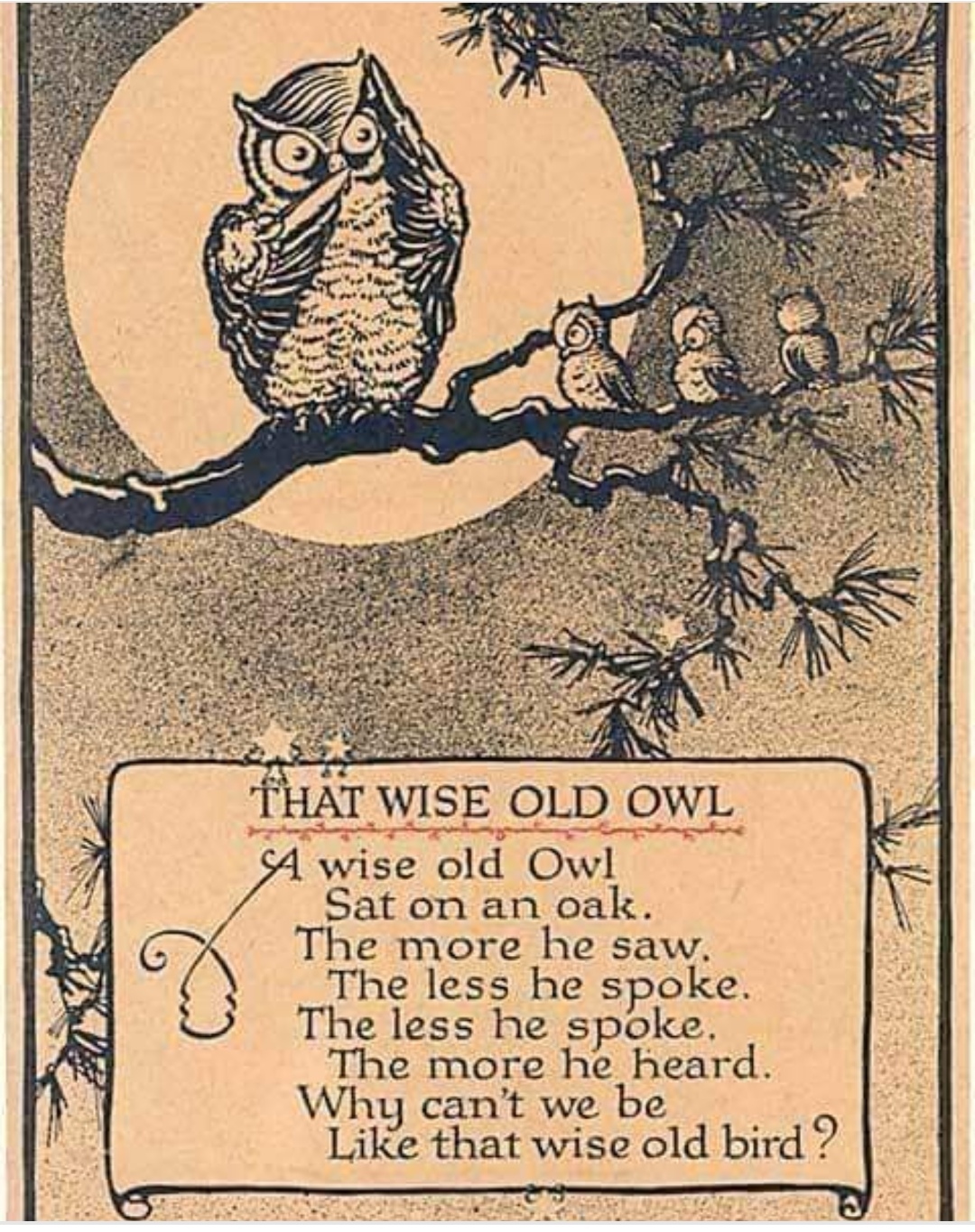 A wise old owl sat on an oak, The more he saw, the less he spoke, The less he spoke, the more he heard, Why can’t we all be like that wise old bird?
