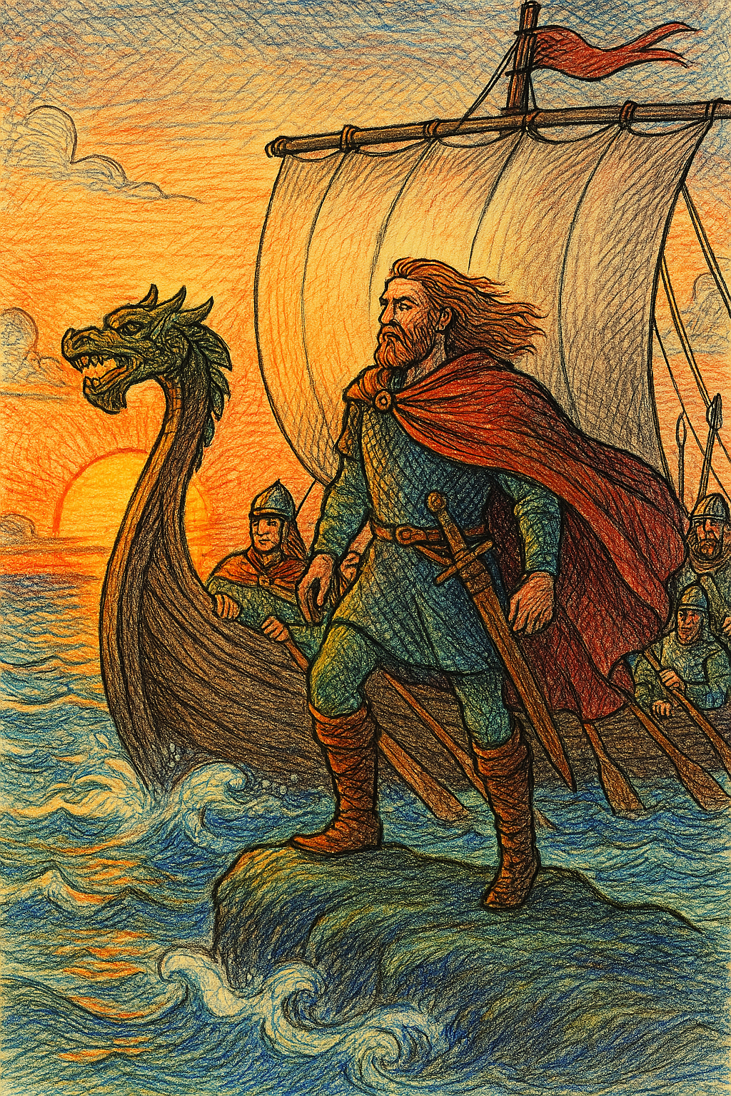 Biz’ bátor Beowli búsongása befejeződött, s bizony burkolatlanul boldogan beleegyezett a dologba, s a dánok diadalmasan dörmögtek. Iziben indultak is iszonyatos izgalmakban még mielőtt másnap magasra mászna magában a nagyon narancsszínűből növekvő nap. Nem nagyon tétováztak, a tenger tajtékos tetején tettek meg megannyi mérföldet, míg mindnyájan megérkeztek. Könnyedén kirakodtak. A költséges kabátokat, s a hasonló holmikat hatalmas halmokba hordták. Ajándéknak akarták adni, amint akkoriban ilyesfajta illendőségek igen ildomosak voltak. „Vendégségbe vigyél vegyesen valamit” volt a jelszó. Jóbarátnak lyukas jakbőrt jellemtelen adni. Azonban az aranyos amfora ajánlott. Azután, amint abbahagyták az aranyos ajándékok poros partra pakolását, pár percnyi pörlekedés végeztével vitézünket vezérükhöz vezették.